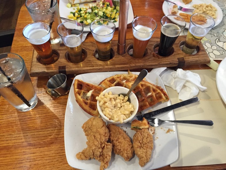 All good beers, but I was surprised that my favorite was the Chile Beer, a style in which I have not had much enjoyment. But this was a balanced and nuanced flavor, and didn’t just set my mouth on fire. Habaneros gave it a little heat, but it was mellowed out by the quintessentially Colorado inclusion of green chiles. I found it to be perfectly paired with Steamworks Chicken and Waffles (batter audaciously filled with green peppers). The beer played complimentary with that unique addition and the spices in the fried chix but contrasted sweetly against the maple syrup.